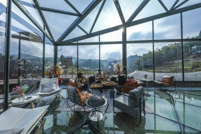 在猎神村矿咖民宿全景玻璃阳光室,山中风景一览无余。熊伟摄