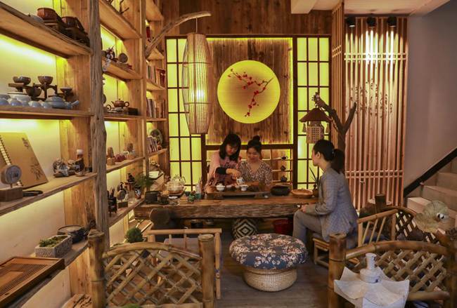 游客在猎神村商业街内茶室品茶。熊伟摄