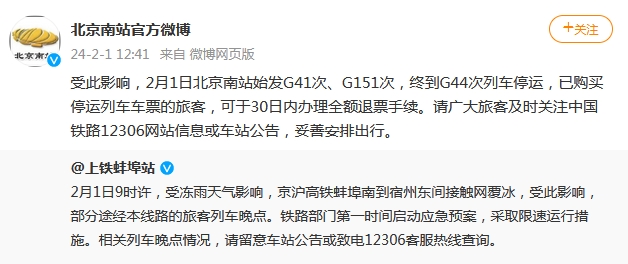 另据北京南站官方微博消息,受此影响,2月1日北京南站始发G41次、G151次,终到G44次列车停运,已购买停运列车车票的旅客,可于30日内办理全额退票手续。请广大旅客及时关注中国铁路12306网站信息或车站公告,妥善安排出行。