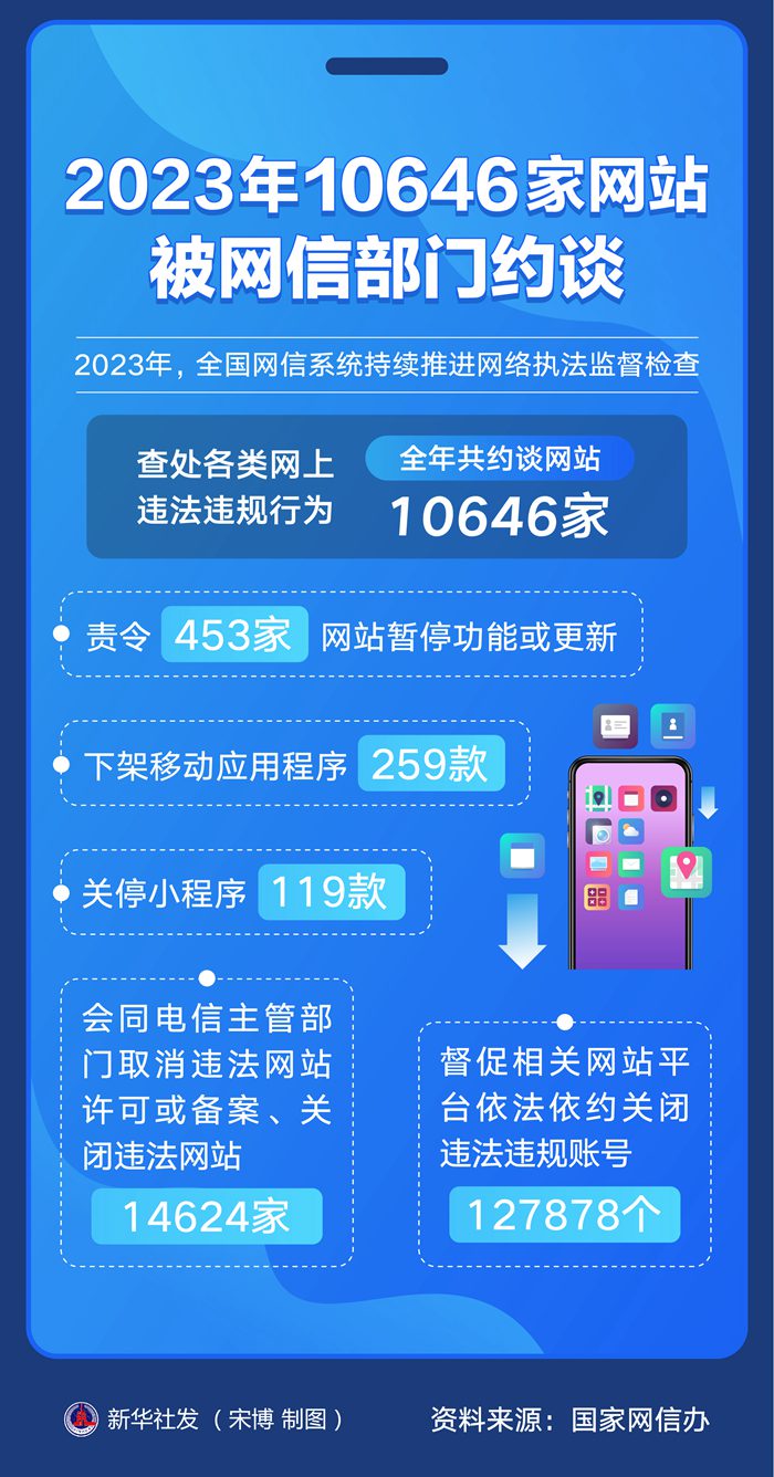 新华社北京1月31日电 记者31日从国家网信办获悉,2023年,全国网信系统持续推进网络执法监督检查,查处各类网上违法违规行为,全年共约谈网站10646家,责令453家网站暂停功能或更新,下架移动应用程序259款,关停小程序119款,会同电信主管部门取消违法网站许可或备案、关闭违法网站14624家,督促相关网站平台依法依约关闭违法违规账号127878个。