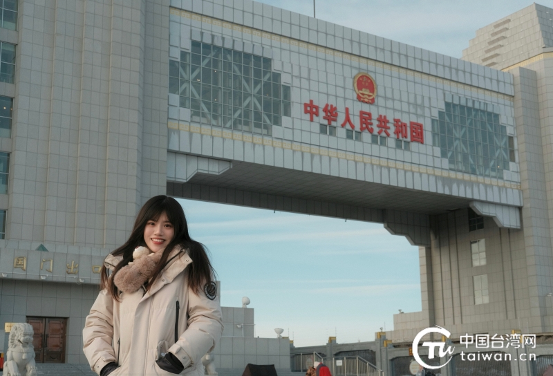 1月27日,2024年全国台联第三十届台胞青年冬令营内蒙古分营一行人前往中俄第五代国门参访,陈纪陵于中俄第五代国门前“打卡”留念。(台湾同学 王奕勋 摄)