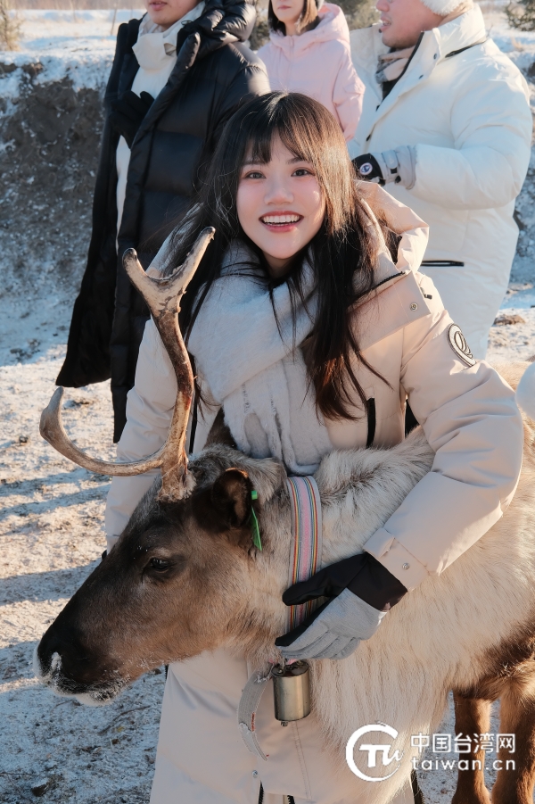 1月26日,2024年全国台联第三十届台胞青年冬令营内蒙古分营一行人前往敖鲁古雅鄂温克民族乡,陈纪陵与驯鹿合影留念。(台湾同学 王奕勋 摄)