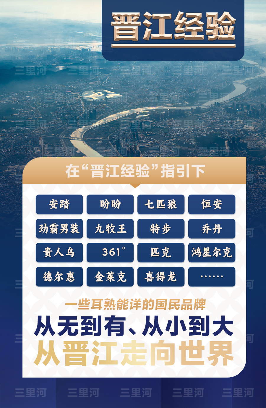 你可能不知道晋江是个仅有700多平方公里的县城,但你一定听说过,安踏、盼盼、七匹狼、恒安、劲霸男装、鸿星尔克、九牧王、特步、乔丹、贵人鸟、361°、德尔惠、金莱克、喜得龙……