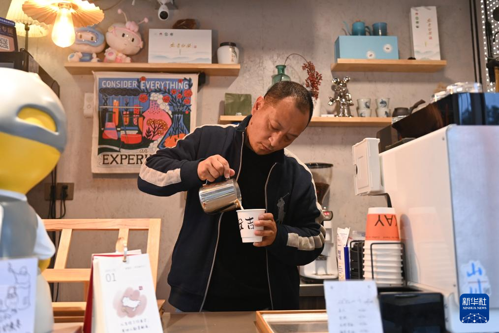 2月1日,山川乡“山川日记”民宿主金绪成为客人调制咖啡。据了解,2019年金绪成将老宅改造为民宿,并经营一家咖啡馆。2024年春节期间的6间客房已被预定一空。新华社记者 黄宗治 摄