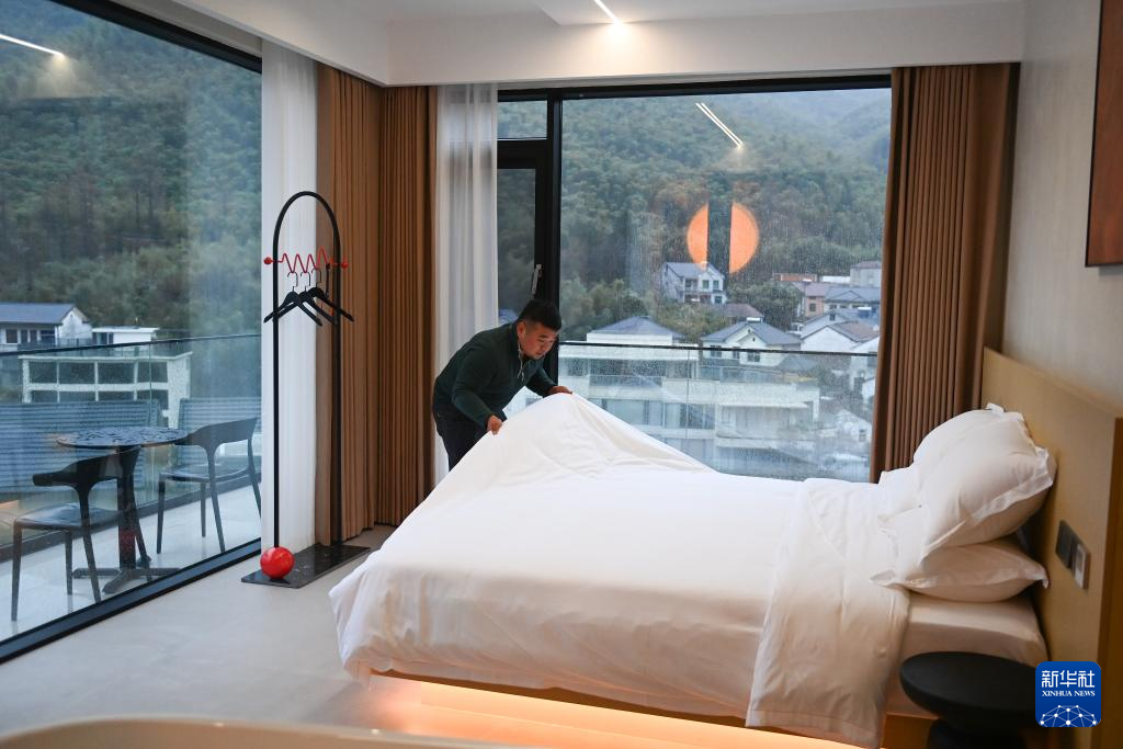 2月1日,山川乡“入画”民宿主刘捷在整理房间。据了解,刘捷与妻子2023年将老宅改造为以星空为主题的民宿,包含9间客房,计划于2024年春节期间试营业。新华社记者 黄宗治 摄