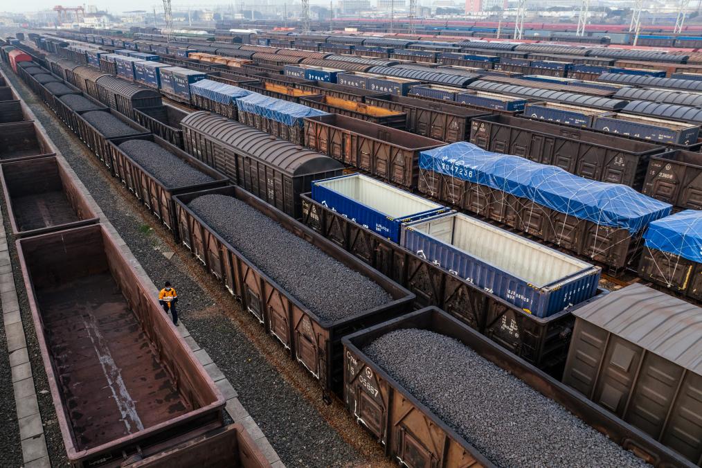 1月30日,在襄阳北车站,调车作业人员检查车辆连挂状态时经过一列运煤车辆(无人机照片)。新华社记者 伍志尊 摄