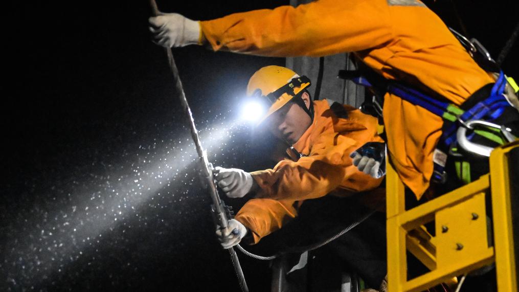 1月31日,检修工在对贵南高铁线路上的架空地线进行仔细检查。新华社记者 张爱林 摄
