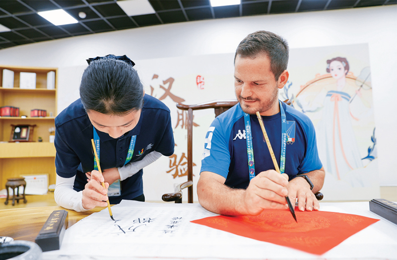 图为2023年7月31日,在成都大运村,来自意大利的达米亚诺·多梅尼科·瓦莱里奥(右)学习用汉字书写自己的名字。成都大运村里设置了书法、国画、蜀绣、传统乐器等丰富多彩的中国文化互动体验项目。运动员和教练员在休息之时,纷纷前来感受中国文化的魅力,了解学习中国文化。 新华社记者 沈伯韩/摄