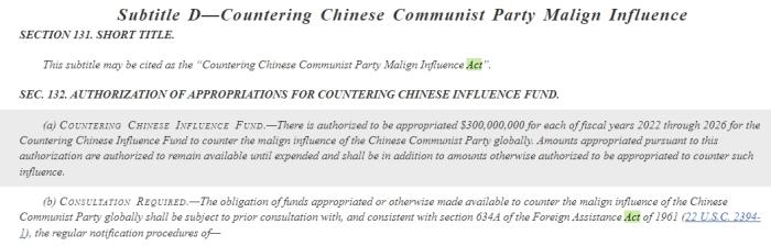 具体内容为:“授权在2022年至2026年的每个财政年度,为‘对抗中国影响力基金’拨款3亿美元,以对抗中国共产党在全球的恶意影响。”