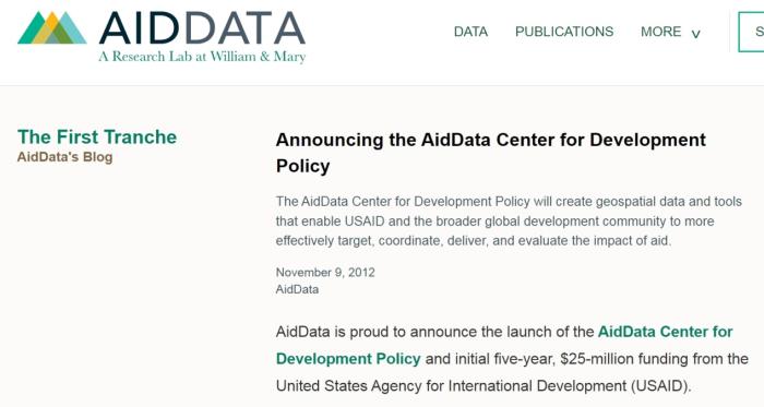 “援助数据”项目(AidData)官网上关于接受美国国际开发署最初5年2500万美元资助的说明。