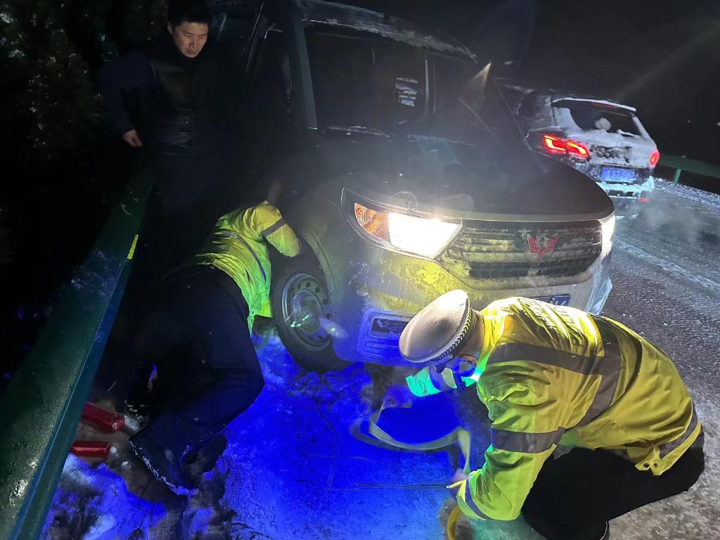阜阳市交警在高速公路上救援冰雪路面侧滑车辆。(李良 摄)