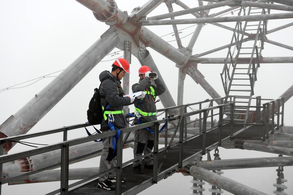 张洲(右)和张磊磊在1000千伏淮芜线长江大跨越北站电塔上作业。新华社记者刘军喜 摄