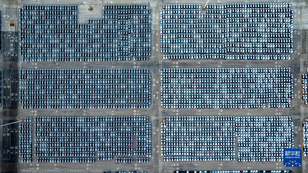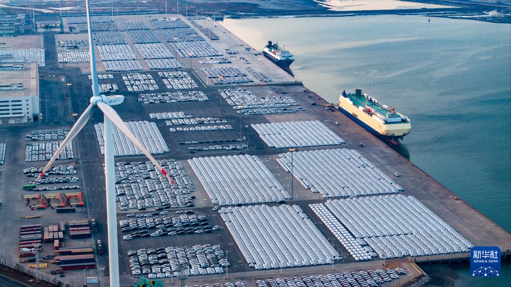 2月3日,汽车整齐排列在天津港海嘉滚装码头(无人机照片)。新华社记者 赵子硕 摄