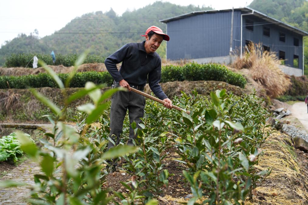 村民毛可顺在管护茶树。新华社记者郭圻 摄