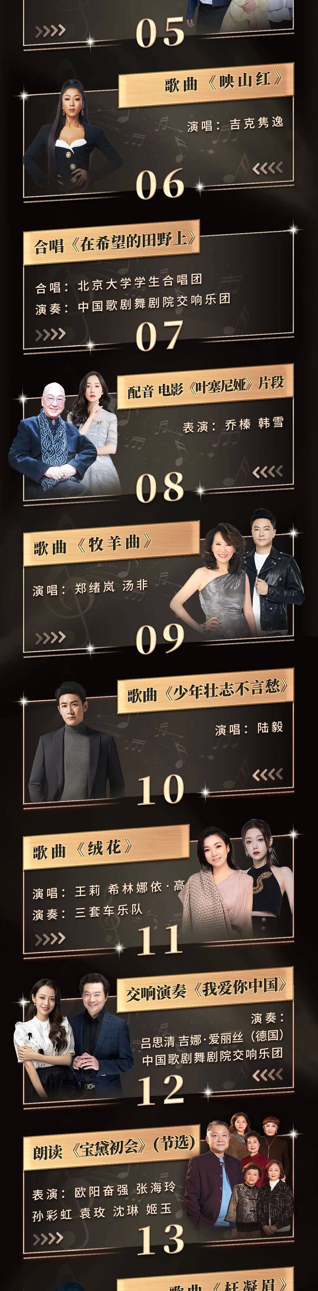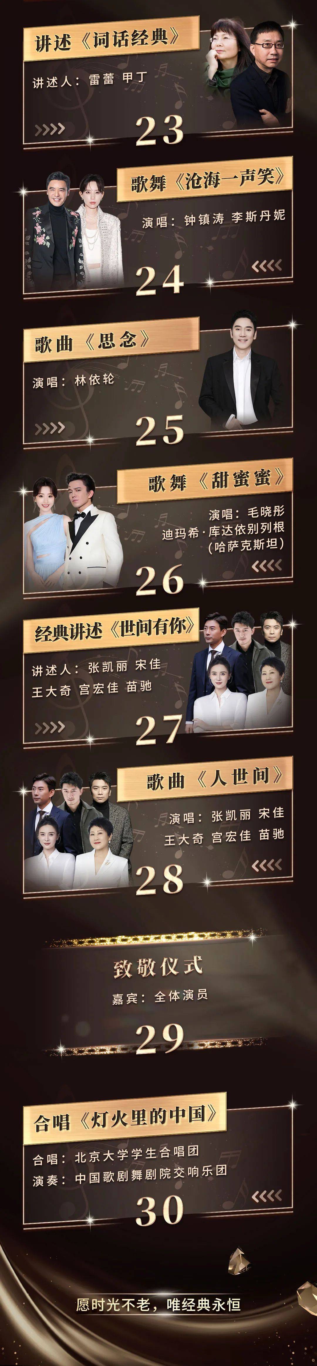 晚会以时间为轴,拟选以家国情怀为主题的《我爱你中国》,以民族音乐为基础的《映山红》《九九艳阳天》,以时代精神为主旨的《在希望的田野上》,以美好情感为核心的《甜蜜蜜》等经典佳作,让我们共同穿透时空,与记忆深处的感动重逢。