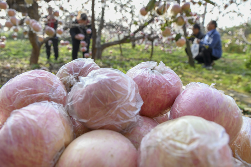 济源市邵原镇史家腰村农民在果园釆摘富硒苹果。新华社发(苗秋闹摄)