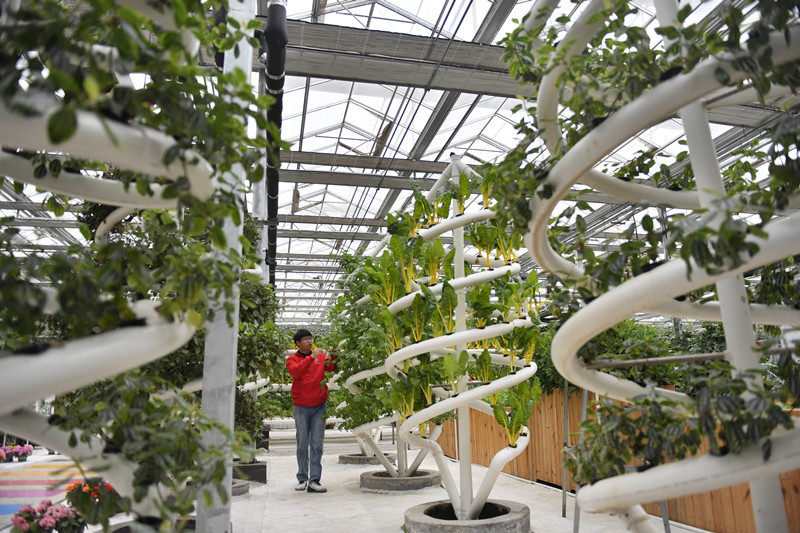 在河北省曲周县育苗产业园,苗乐园科技小院的学生在查看无土栽培蔬菜。新华社记者 岳文婷 摄