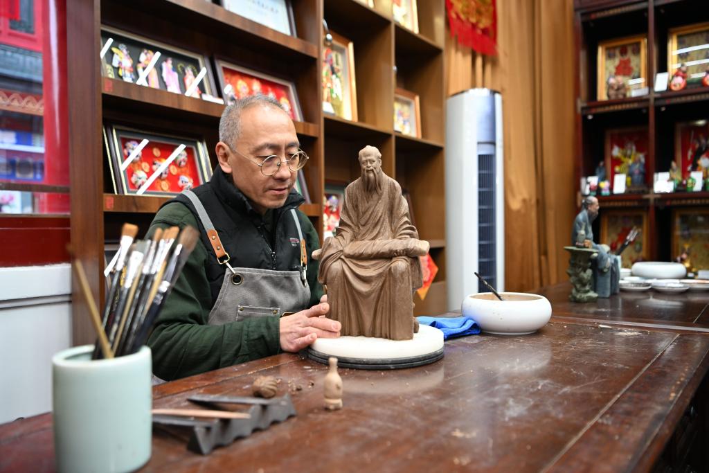 在天津古文化街,泥人张制作部的师傅刘强在店内工作。新华社记者李然 摄