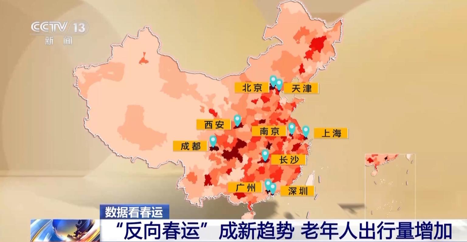 数据显示,今年“反向春运”趋势明显,更多的老年人选择前往子女的工作地团聚,他们的来源地主要集中在四川、河北、湖北、湖南等省份,而主要目的地则是北京、西安、天津、成都、广州、上海、南京、深圳、长沙等一、二线中心城市。