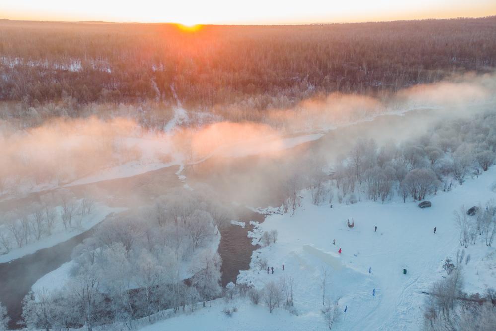 立春已过,地处黑龙江省北部的逊克县克林镇平台村仍寒意逼人。库尔滨河沿平台村流淌而过,氤氲水汽在低温中升腾,凝结在沿岸的树枝之上,造就了绵延十余公里的雾凇梦幻景观。