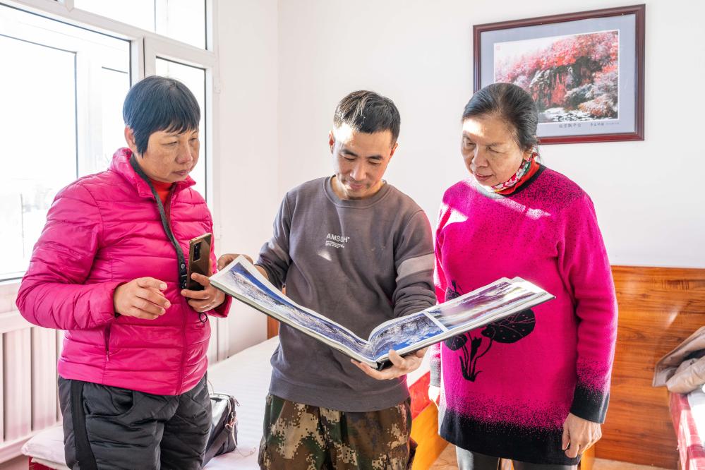 2月2日,黑龙江省逊克县克林镇平台村村民程立波(中)在自家的家庭旅馆为刚住店的游客讲解雾凇摄影点位和拍摄技巧。新华社记者 谢剑飞 摄