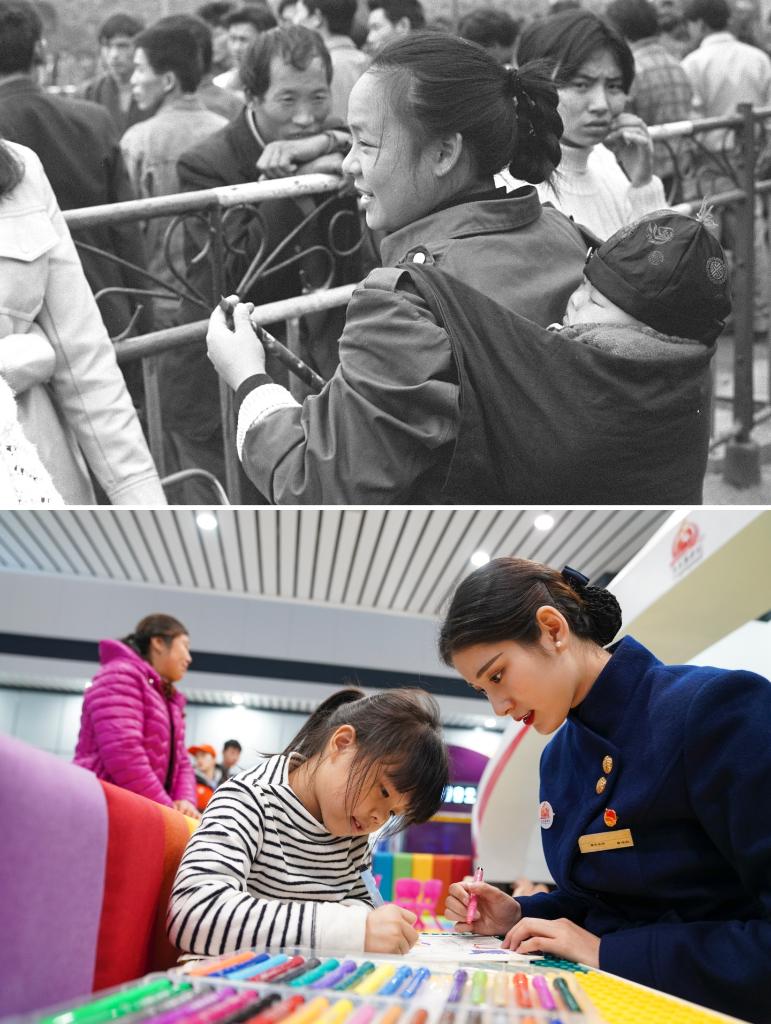拼版照片:上图为1995年春运期间,在广州火车站,来自四川的“打工妹”赶早乘火车回家过年(新华社记者陈学思摄);下图为2020年1月10日,在重庆西站红岩服务站的儿童游乐园内,志愿者曾念红(右)陪伴候车的小朋友画画(新华社记者刘潺摄)。