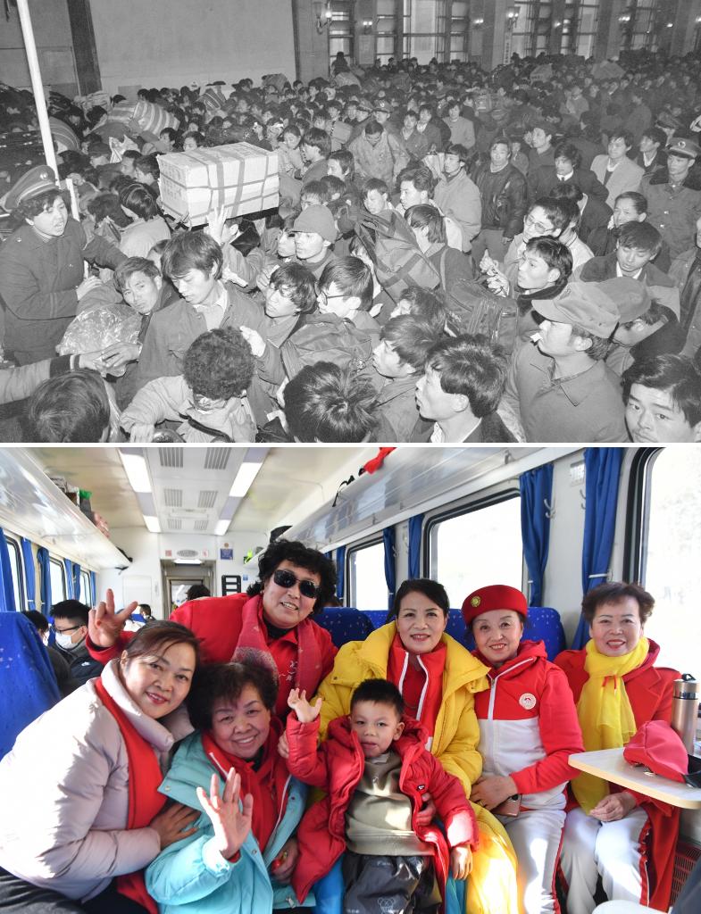 拼版照片:上图为1993年春运期间,旅客在北京火车站排队进站(新华社记者唐召明摄);下图为2024年1月28日,乘坐公益“慢火车”6063次列车前往宝成铁路秦岭站欣赏雪景的旅客在车内合影(新华社记者张博文摄)。