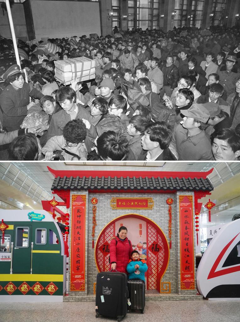 拼版照片:上图为1993年1月12日,北京火车站开始进入春运高峰,旅客在排队进站(新华社记者唐召明摄);下图为2020年1月10日,旅客在南京南站内布置的“幸福小康照相馆”拍照留念(新华社记者季春鹏摄)。