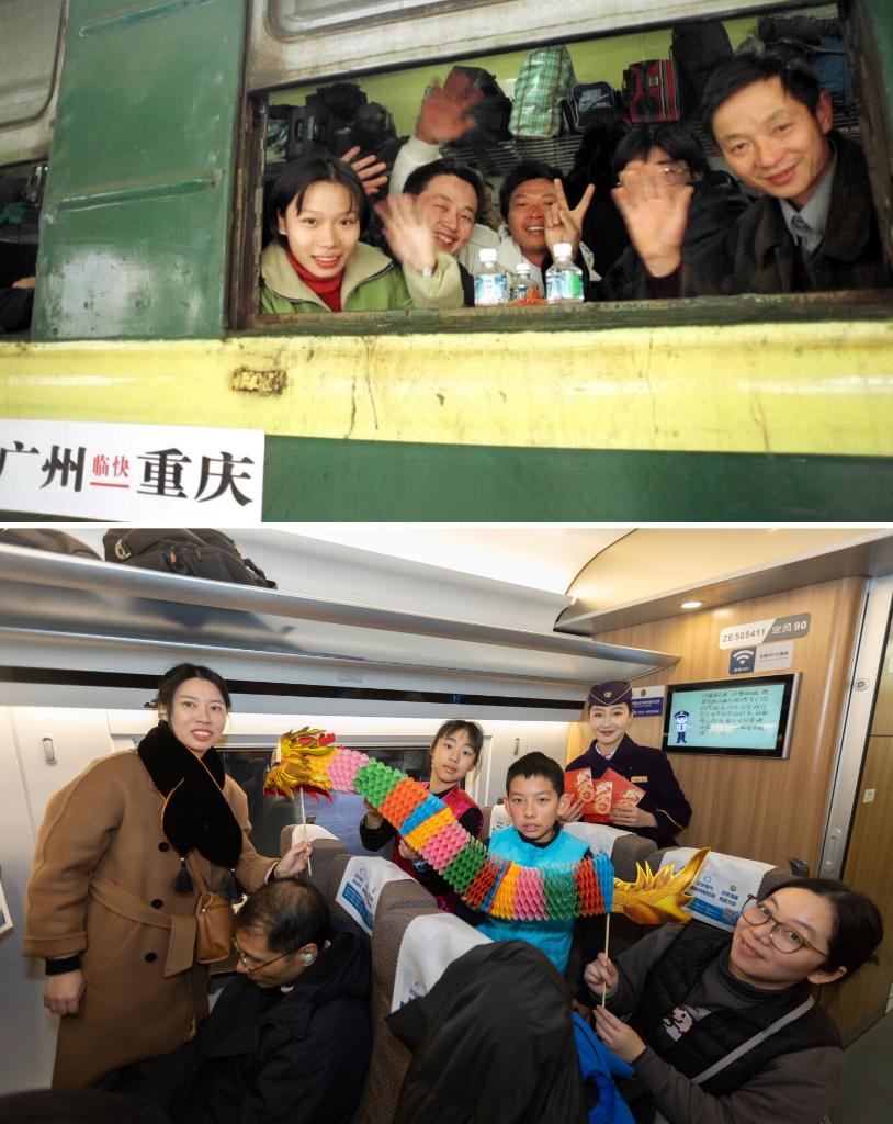 拼版照片:上图为2000年春运期间,在深圳打工的重庆乘客在广州火车站乘火车返乡(新华社记者壮锦摄);下图为2024年1月26日,旅客在G10次高铁车厢内舞动龙年装饰(新华社记者王翔摄)。