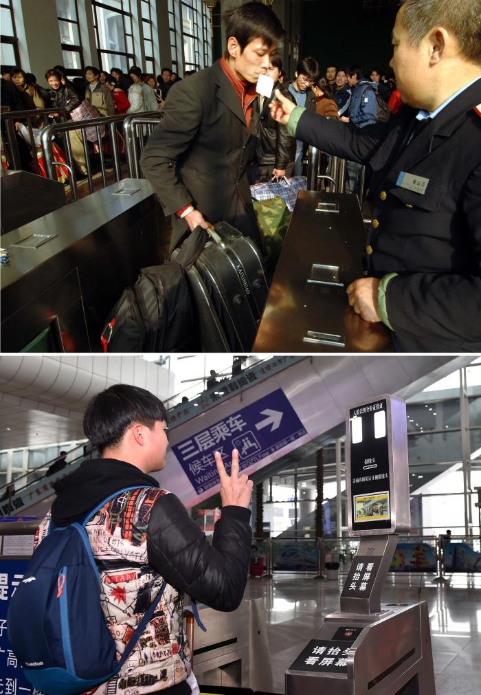 拼版照片:上图为2006年1月14日,旅客在北京站通过人工检票进站(新华社记者李文摄);下图为2017年1月13日,一名旅客在广州南站体验使用人脸识别系统验票验证进站(新华社记者梁旭摄)。