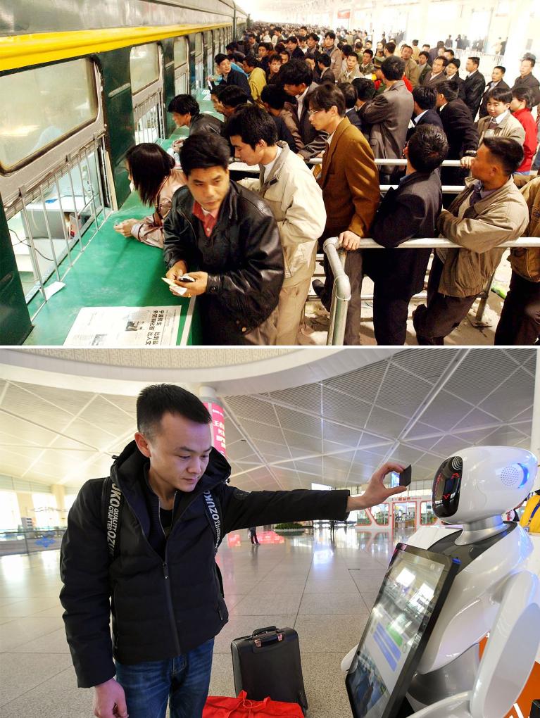 拼版照片:上图为2003年1月20日,旅客们在位于广州市黄沙大道的一家仓库中的临时售票处购买车票(新华社记者周文杰摄);下图为2019年1月22日,在呼和浩特火车东站,旅客将车票放在智能机器人面前扫码获取乘车信息(新华社记者彭源摄)。