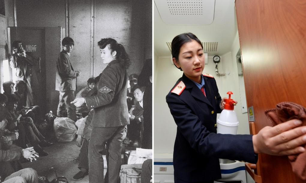 拼版照片:左图为1994年春运期间,在济南铁路局“棚代客”列车上,乘务员在向乘客讲解临时搭建的简易厕所使用注意事项(新华社发);右图为2017年1月12日,在兰州铁路局银川客运段增开的银川发往北京的临时旅客列车上,乘务人员在清洁车上的卫生间(新华社记者彭昭之摄)。