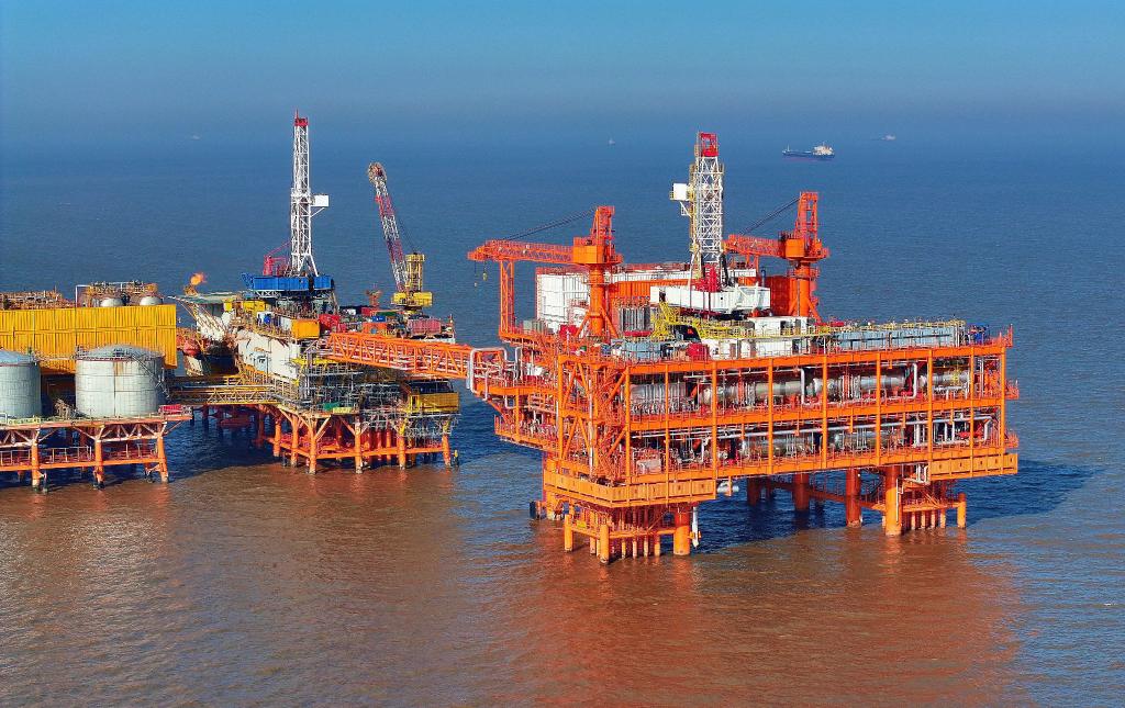 这是1月25日拍摄的埕北油田CEPC(中心平台)(右)(无人机照片)。新华社记者 赵子硕 摄