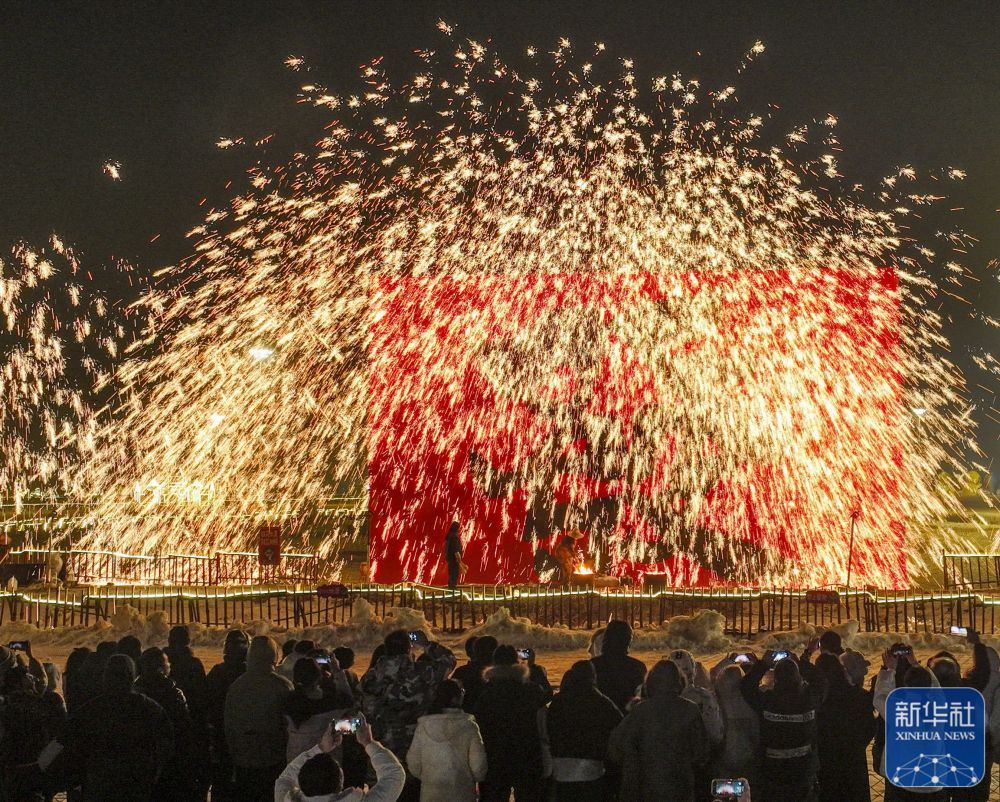 2月10日,游客在河北省遵化市团瓢庄镇山里各庄景区观看打铁花表演。新华社发(刘满仓 摄)
