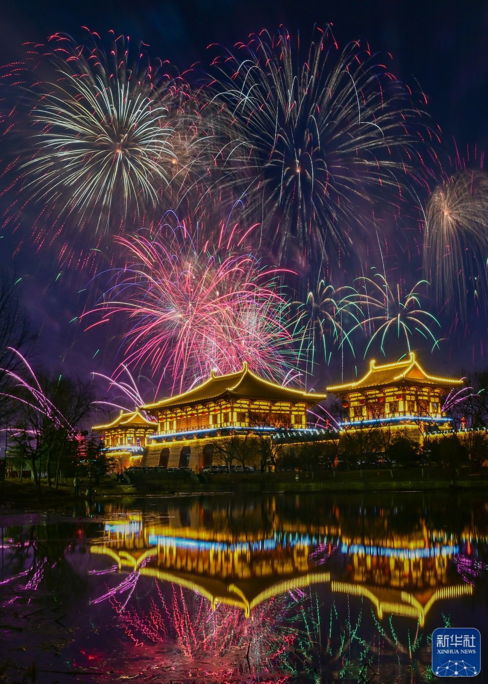 2月10日,河南洛阳次第腾空的焰火五彩斑斓。新华社发(李卫超 摄)