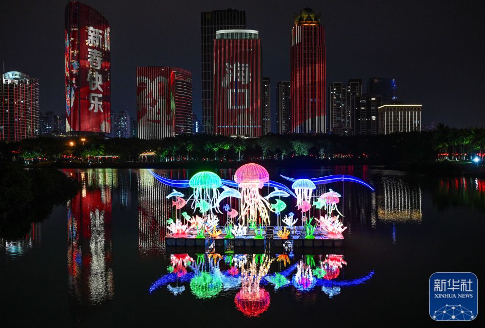 2月10日在海口市万绿园拍摄的万春会花灯和滨海大道高层建筑灯光秀。新华社记者 蒲晓旭 摄