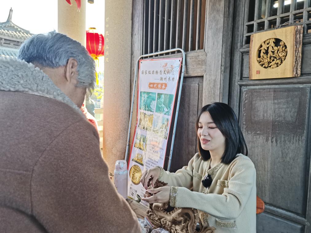 既有传统的木雕虾蟹篓,也有富有生活气息的木雕头簪、木雕“十二生肖”玩偶……潮州木雕非遗传承人、“90后”陈嘉的展位上,木雕展品琳琅满目。她说,如今关注非遗的游客特别是年轻人越来越多,“我们现在对传承非遗越来越有信心,欢迎大家到古城来过大年!”