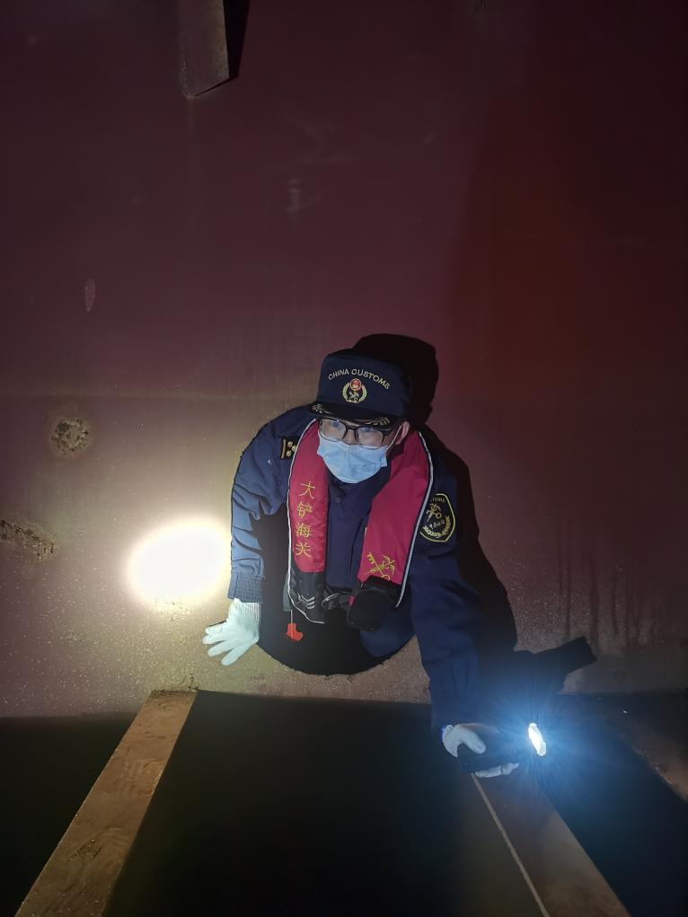 夜幕降临,管仁杰和邹伟明再一次接到出勤任务。两人登上待检船舶,分工协作,查验单证、巡查船体、清点货柜,对油舱、机舱等位置进行核查。