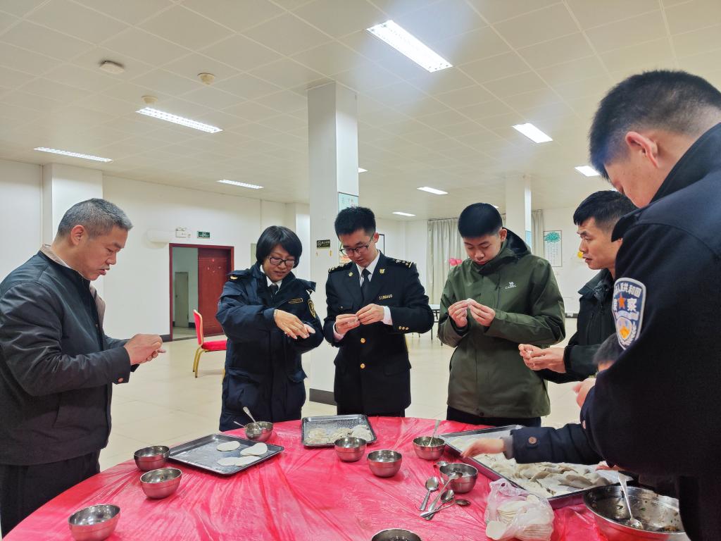 2月9日,大铲海关春节值班的干部职工们一起包饺子。新华社发