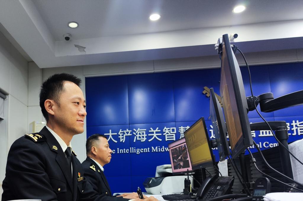 2月9日,大铲海关关员周霆(左)与同事在监控指挥中心值守。新华社发
