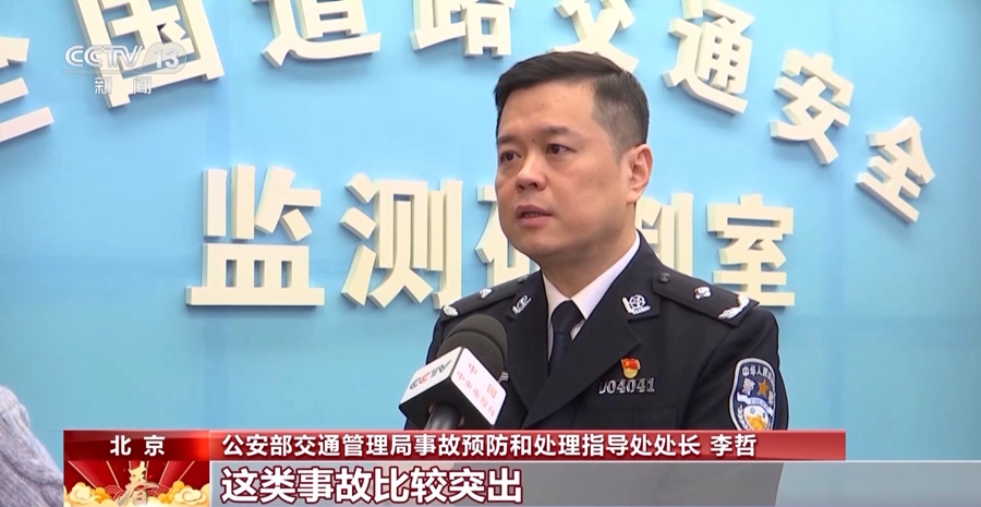 公安部交通管理局事故预防和处理指导处处长 李哲:春节期间,根据交通事故分析,容易多发的事故类型,一般集中在车辆间的碰撞,包括追尾和剐蹭,以及车辆碰撞,不按规定让行,碰撞行人,碰撞非机动车辆,这类事故比较突出。