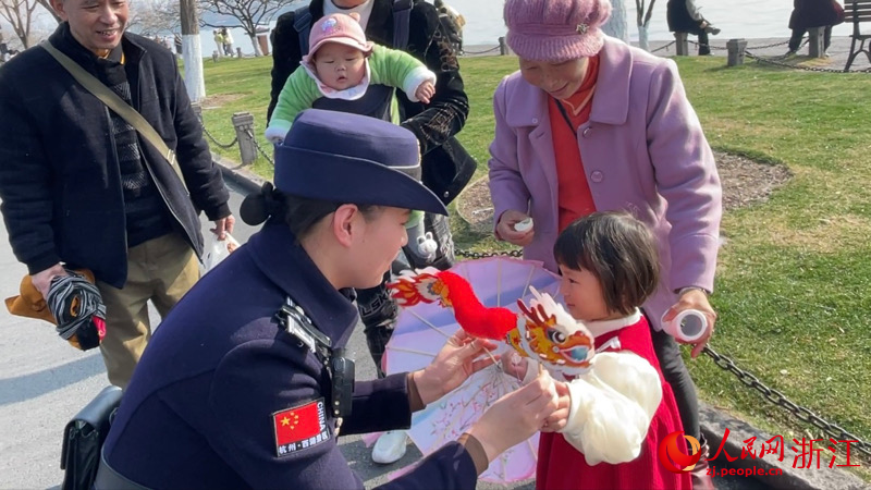 除此之外,西湖女子巡逻队结合“大综合一体化”行政执法改革,以“贴心服务+柔性管理”的工作法为载体,开展“非遗民俗辞旧岁 龙行龘龘迎新春”活动。在春节保障期间,西湖女子巡逻队为市民游客提供咨询服务与帮助、对不文明行为进行劝导、维护西湖景区面上管理秩序、配合处置突发事件,并提供《“小巡姐姐西游记”旅行服务手册》、湿纸巾、果壳袋、暖宝宝等服务用品。同时,设置互动环节,抽取幸运游客赠送非遗手工剪纸舞龙和龙年文创贴纸,与市民分享美丽西湖的人文故事,送上新春祝福。