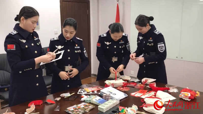 西湖女子巡逻队队员制作非遗手工剪纸“翻花龙”。人民网 秦铭泽摄