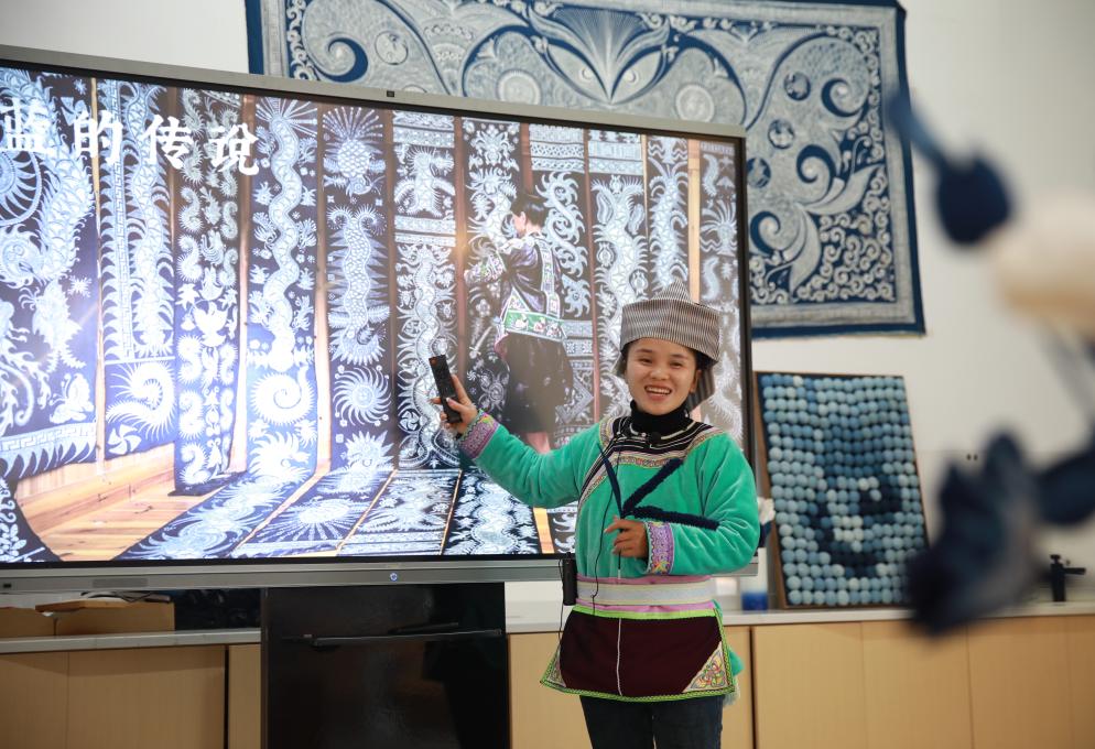 1月30日,贵州省黔东南州榕江县青于蓝蓝染艺术中心内,绣娘吴邦竹正在讲解蓝染非遗技艺。新华社记者周宣妮 摄