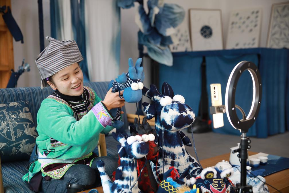 1月30日,贵州省黔东南州榕江县青于蓝蓝染艺术中心内,绣娘吴邦竹正在直播带货。新华社记者周宣妮 摄