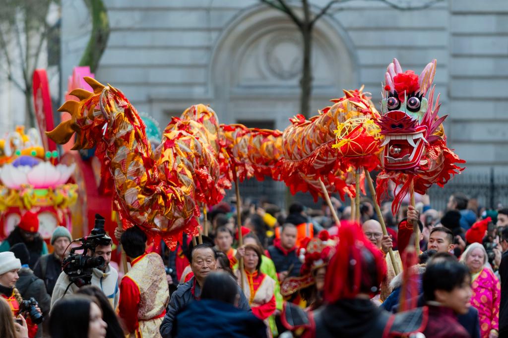 2月11日,人们在英国伦敦的新春巡游活动中观看舞龙表演。新华社发(史蒂芬·程摄)