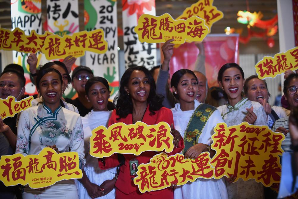 2月6日晚,在埃塞俄比亚亚的斯亚贝巴的博莱国际机场举行的“龙年送福”活动上,工作人员和中国旅客一起庆祝龙年春节。新华社发(迈克尔·特韦尔德摄)