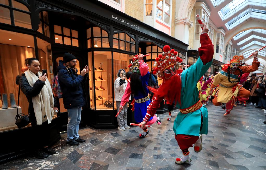 2月10日,在英国伦敦伯灵顿拱廊街,观众观看英歌舞表演。新华社记者 李颖 摄