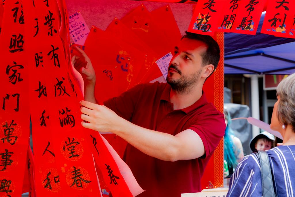 2月10日,在澳大利亚首都堪培拉,一名男子选购春联。新华社发(储晨摄)