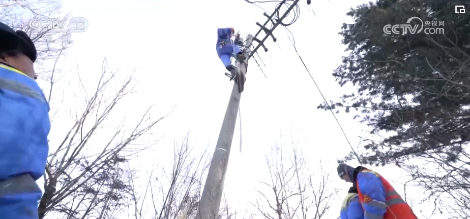 工友们处理完树倒后,两位老师傅又赶紧系上安全带穿上脚扣又爬上通信电杆排查隐患。
